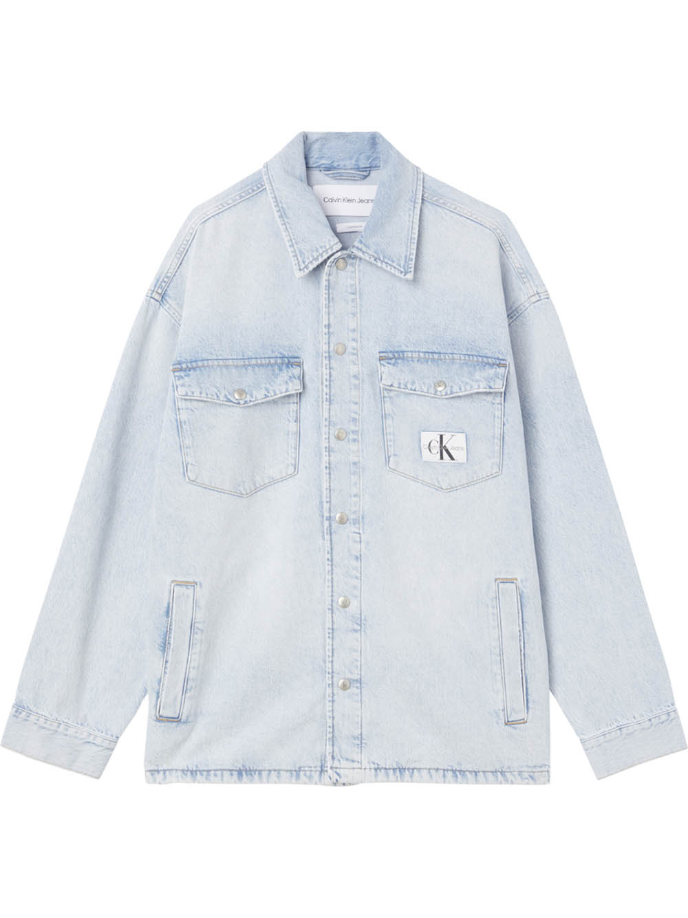 Giacca di jeans oversized da uomo, tasche laterali e sul petto, logo ck applicato