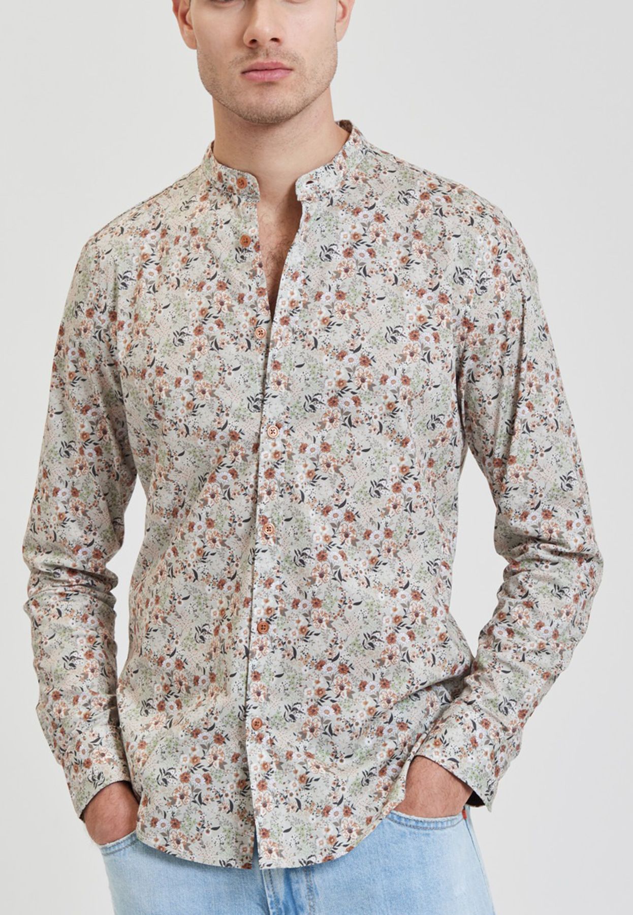 Camicia da uomo a fantasia, chiusura con bottoni, collo coreano