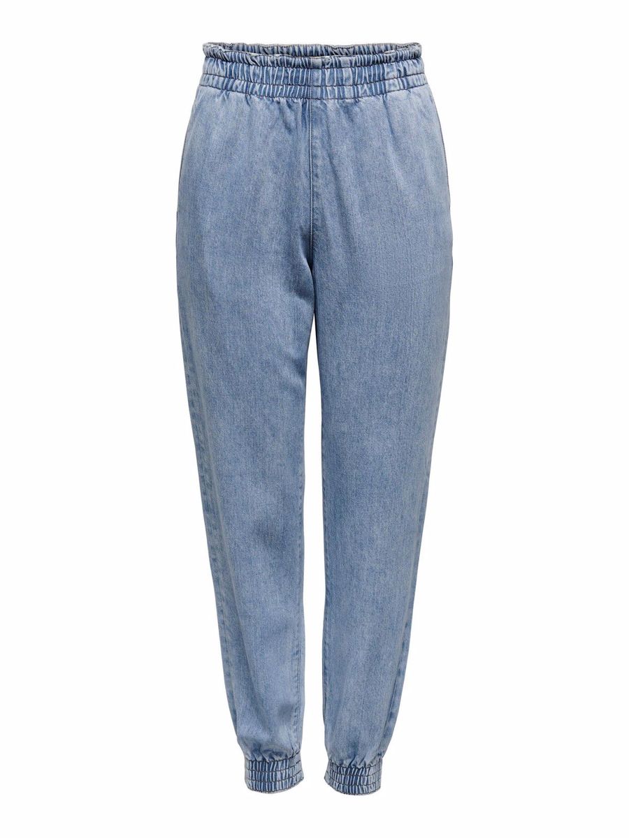 Descrizione: Jeans donna. Brand ONLY. Colore blue denim chiaro. Elastico in vita. Elastici finali caviglie. Tasche america laterali. Tasche retro taglio jeans. Modello QUINN. Carrot fit.