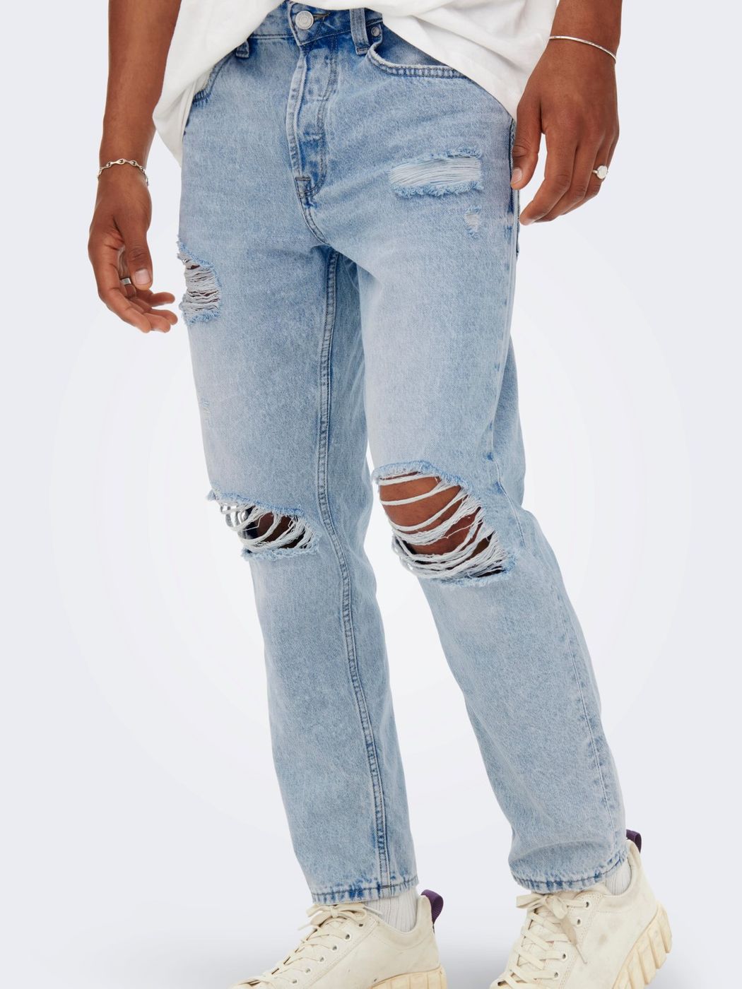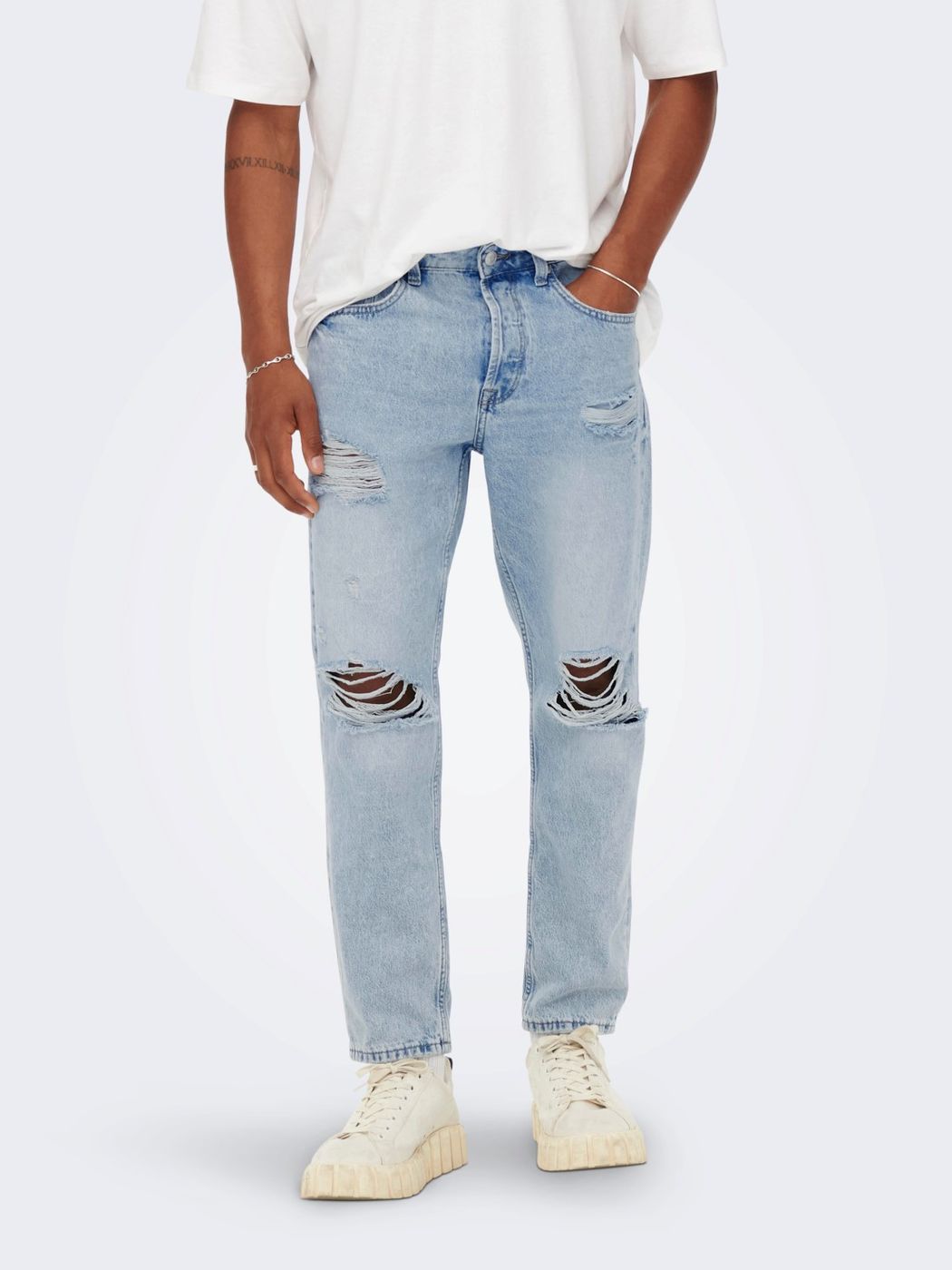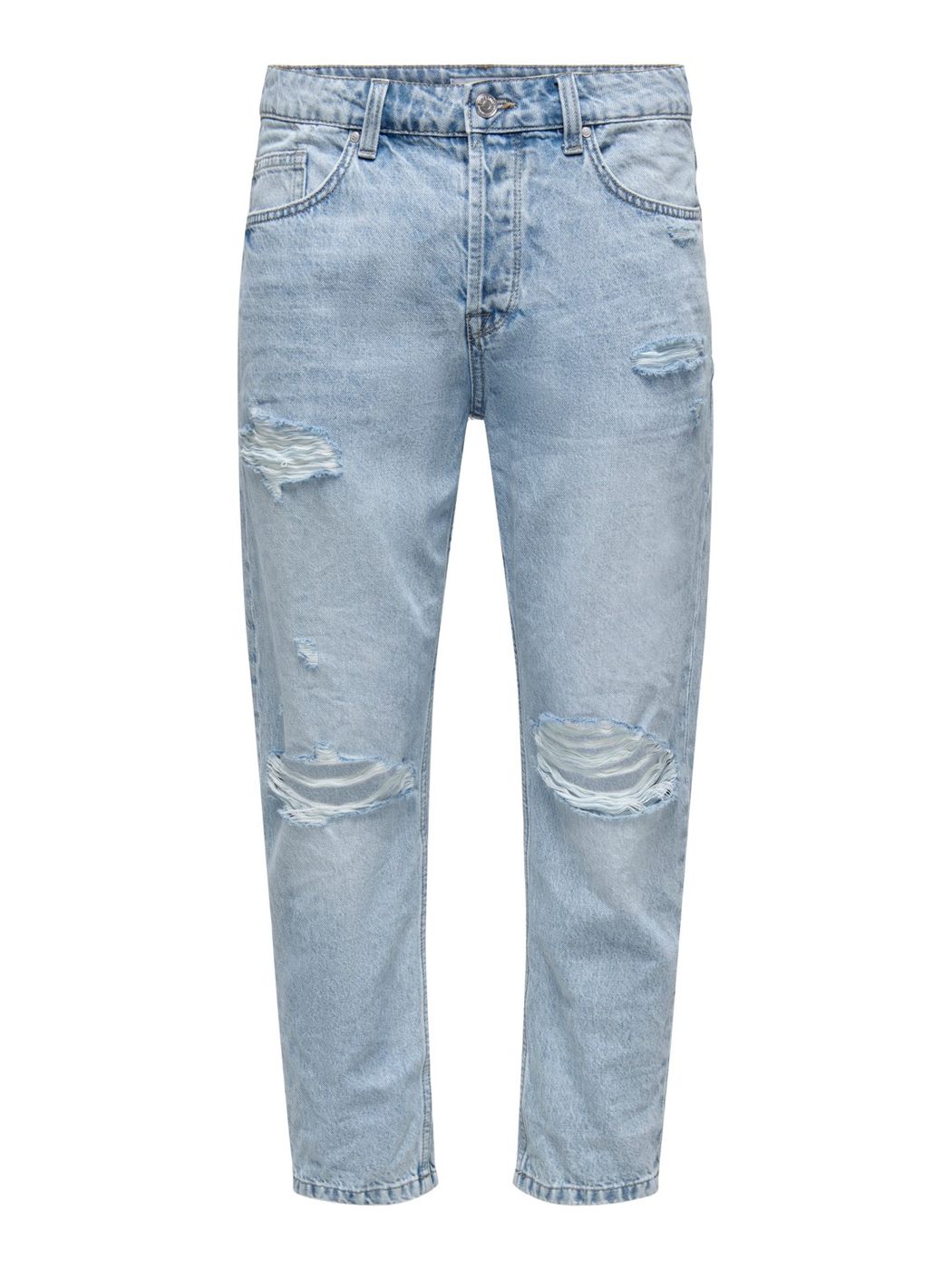 Jeans uomo. lavaggio chiaro rotture e abrasioni diffuse brand ONLY&SONS. mod. avi beam. vestibilità cropped. art. 22022314 lunghezza lengh 32