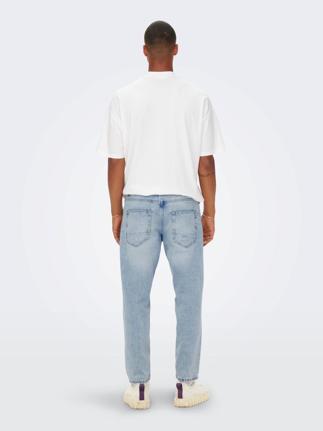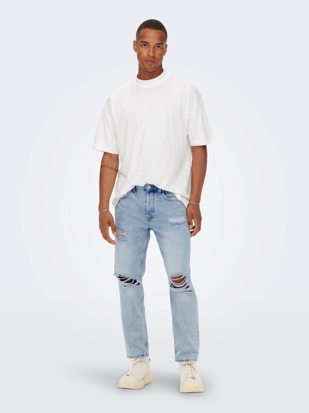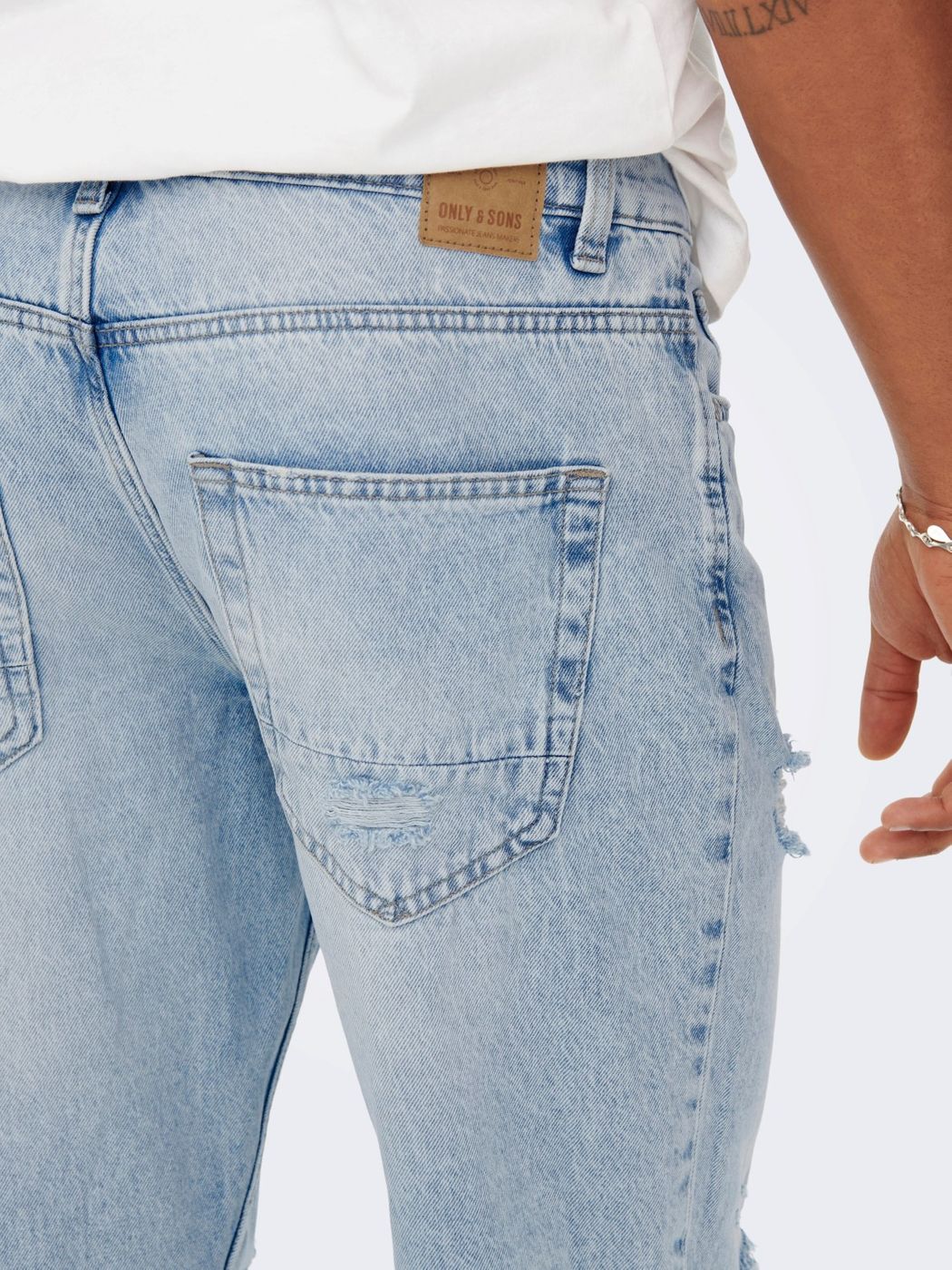 Jeans uomo. lavaggio chiaro rotture e abrasioni diffuse brand ONLY&SONS. mod. avi beam. vestibilità cropped. art. 22022314 lunghezza lengh 32
