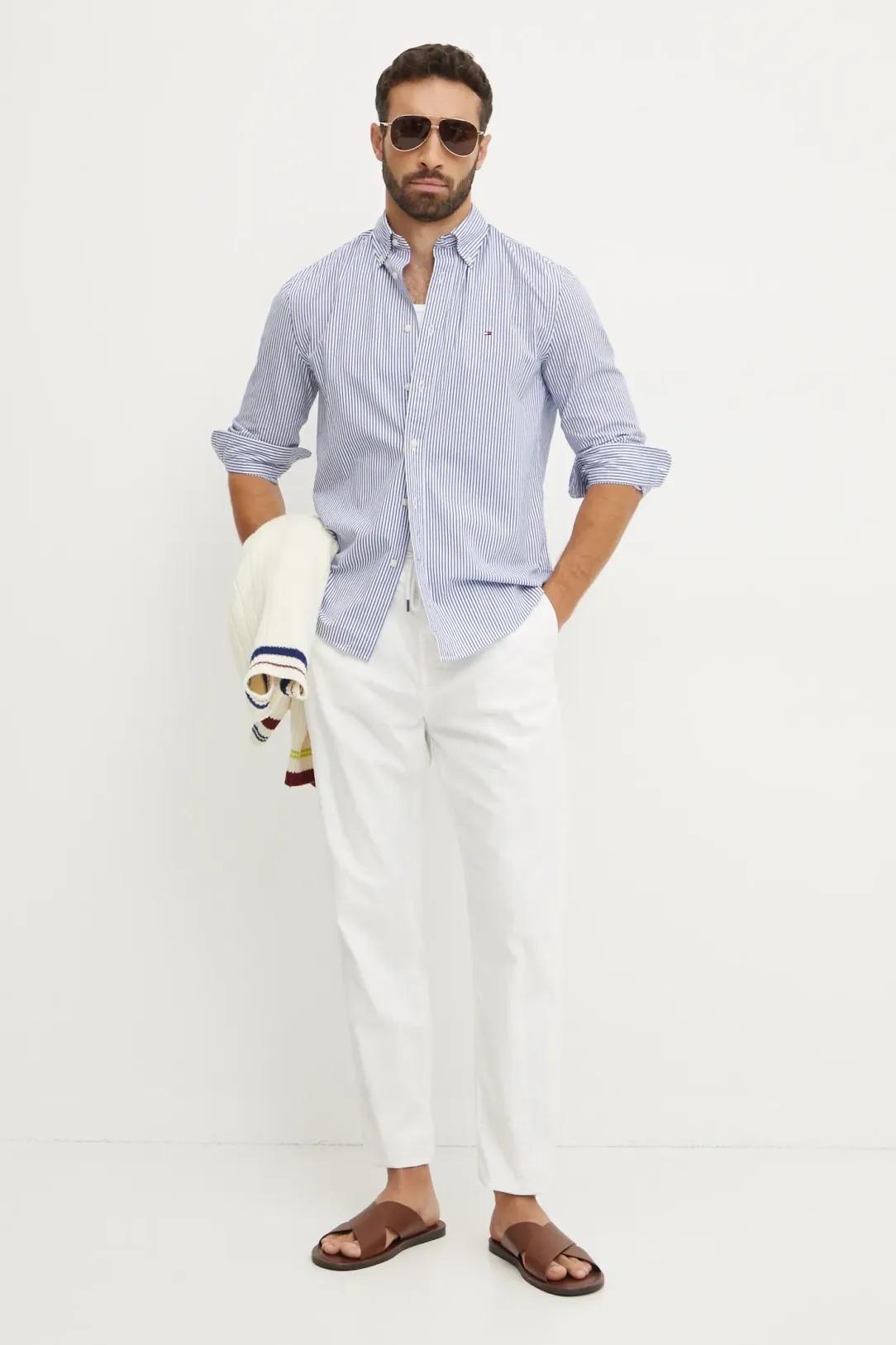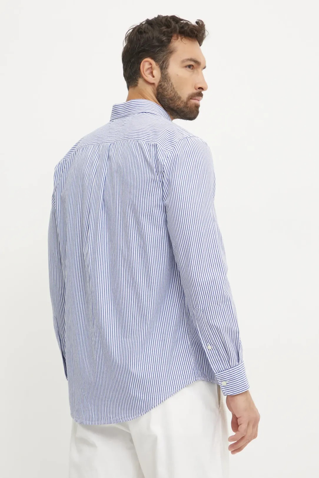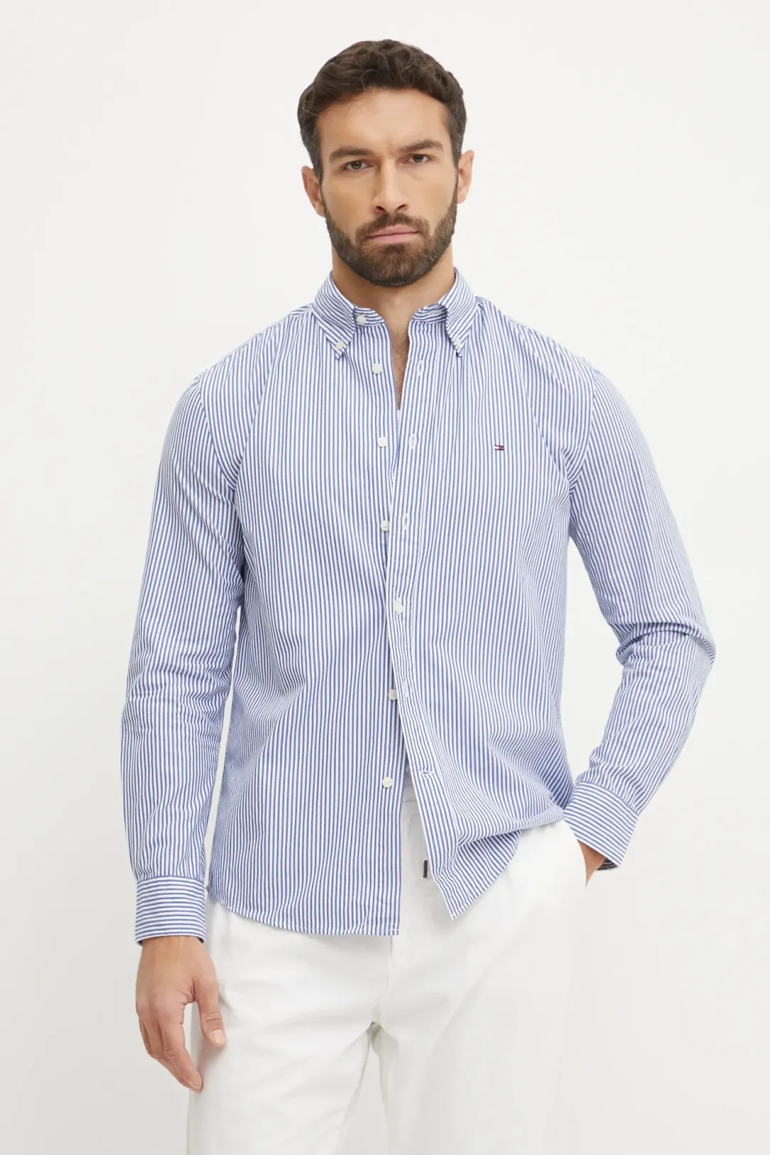 Camicia da uomo a righe, manica lunga, collo classico, regular fit, brand logo bandiera piccolo