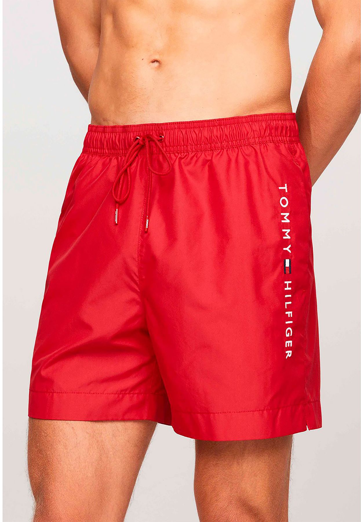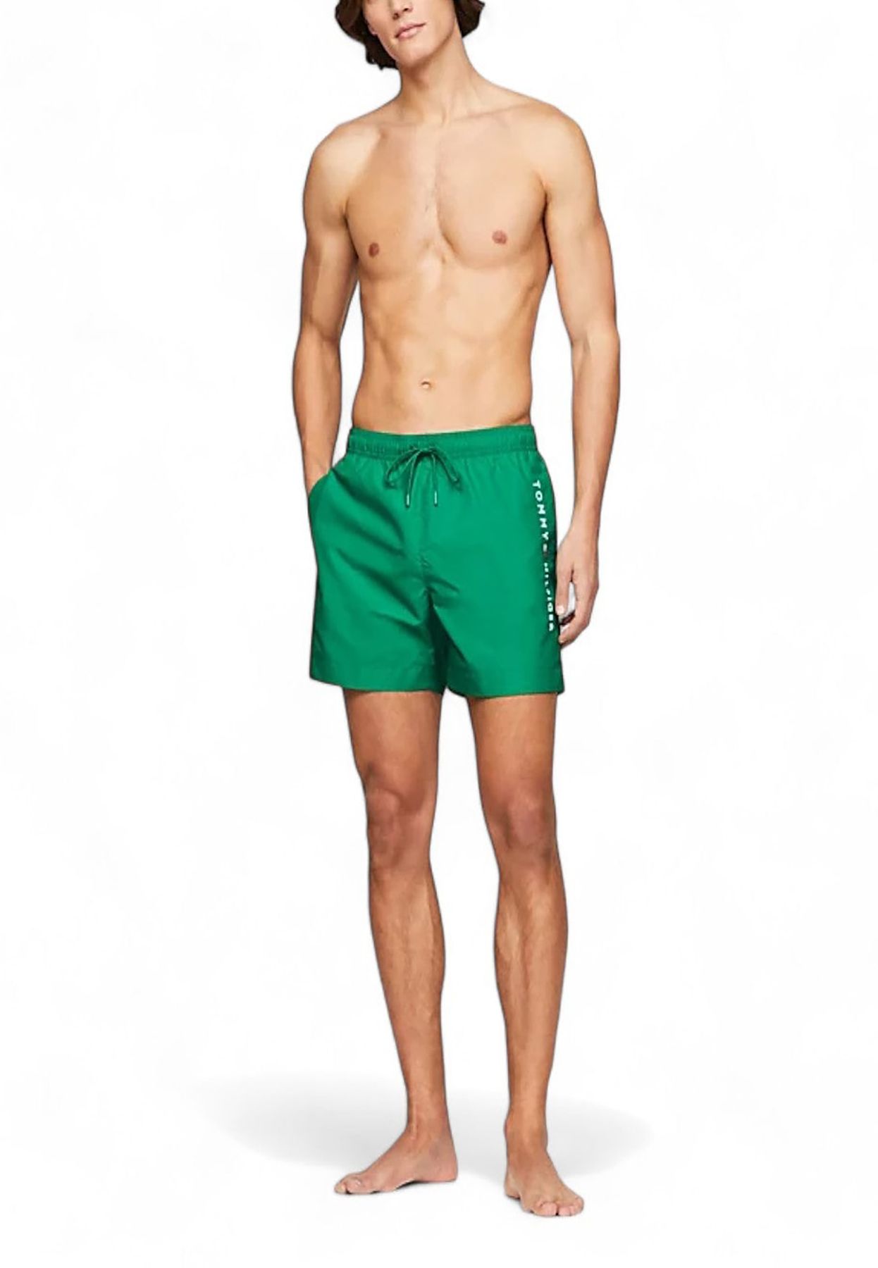 Costume boxer da bagno, tinta unita, chiusura con laccetti ed elastico in vita, brand logo